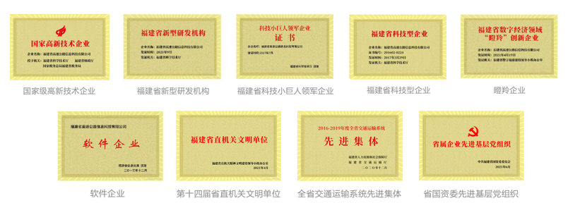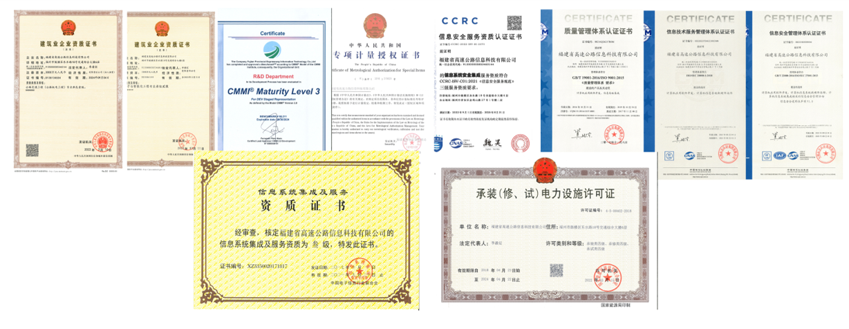 公司先后獲得“國(guó)家高新技術(shù)企業(yè)”“福建省軟件企業(yè)”“福建省科技小巨人企業(yè)”“福州高增企業(yè)”“瞪羚企業(yè)”等榮譽(yù)稱號(hào),取得了公路交通工程(公路機(jī)電工程分項(xiàng))專業(yè)承包壹級(jí)、電子與智能化工程專業(yè)承包壹級(jí)、信息系統(tǒng)集成及服務(wù)三級(jí)、電力承裝承修承試四級(jí)、軟件能力成熟度模型三級(jí) (CMMI_3)認(rèn)證、電子汽車衡及動(dòng)態(tài)公路衡器計(jì)量檢定授權(quán)許可、信息系統(tǒng)安全集成三級(jí),以及ISO9001 質(zhì)量管理體系、 ISO20000 信息技木服務(wù)管理體系、1SO27001 信息安全管理體系認(rèn)證等系列資質(zhì);并擁有發(fā)明專利4項(xiàng),實(shí)用新型專利12項(xiàng),軟件著作權(quán)115項(xiàng),參與行業(yè)標(biāo)準(zhǔn)編制1 項(xiàng)、地方標(biāo)準(zhǔn)編制 2 項(xiàng)。通過技術(shù)創(chuàng)新,促進(jìn)我省高速公路的智能化系統(tǒng)建設(shè)和行業(yè)管理水平的不斷提升。